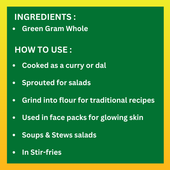 - Green gram is high in dietary fiber, which helps in improving digestion, maintaining gut health, and preventing constipation.